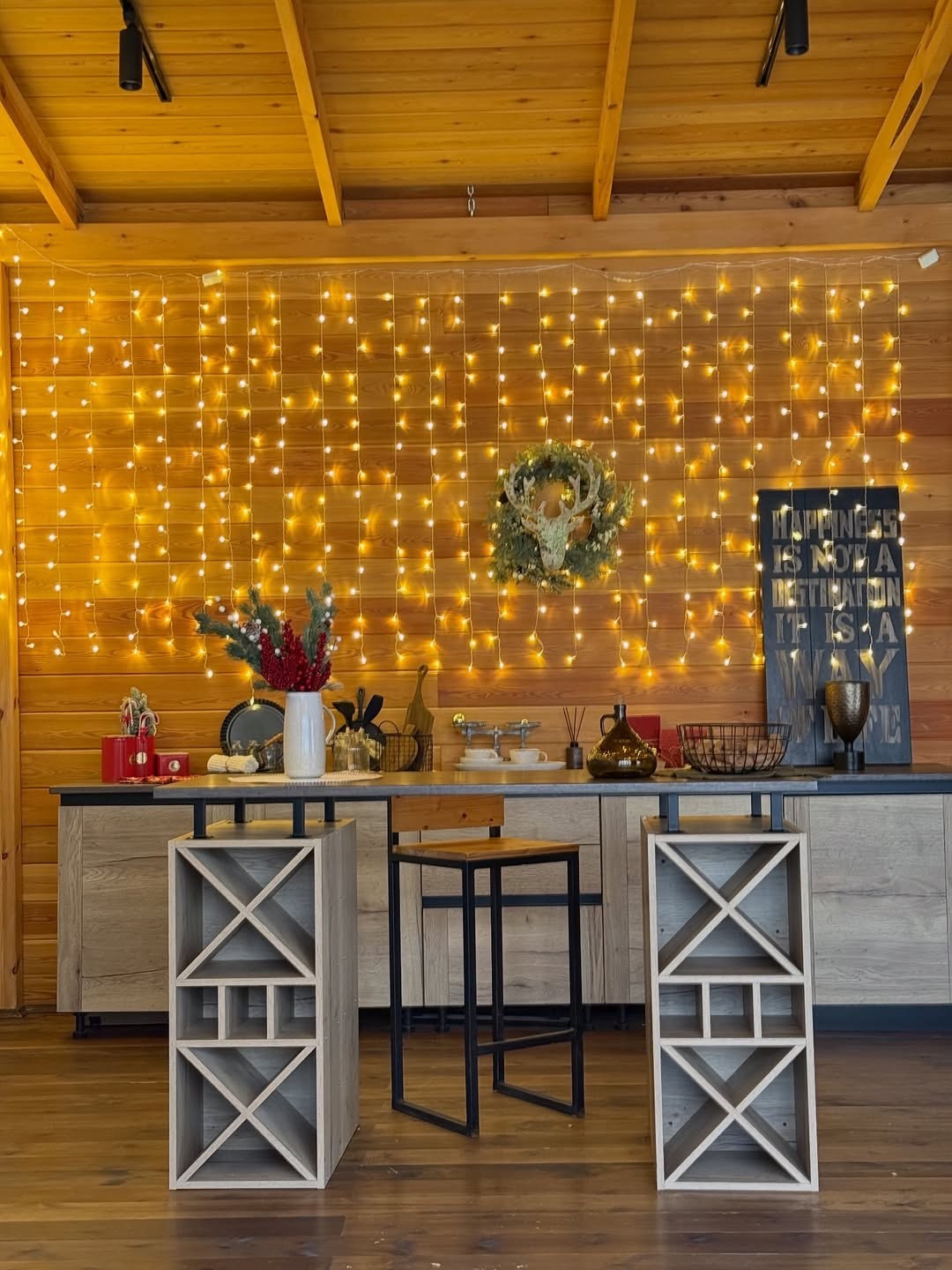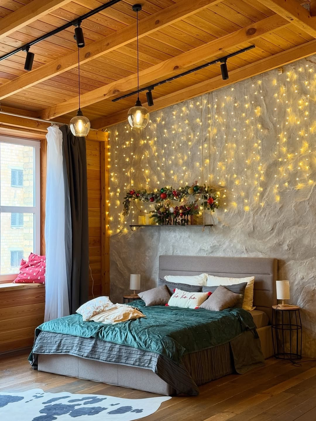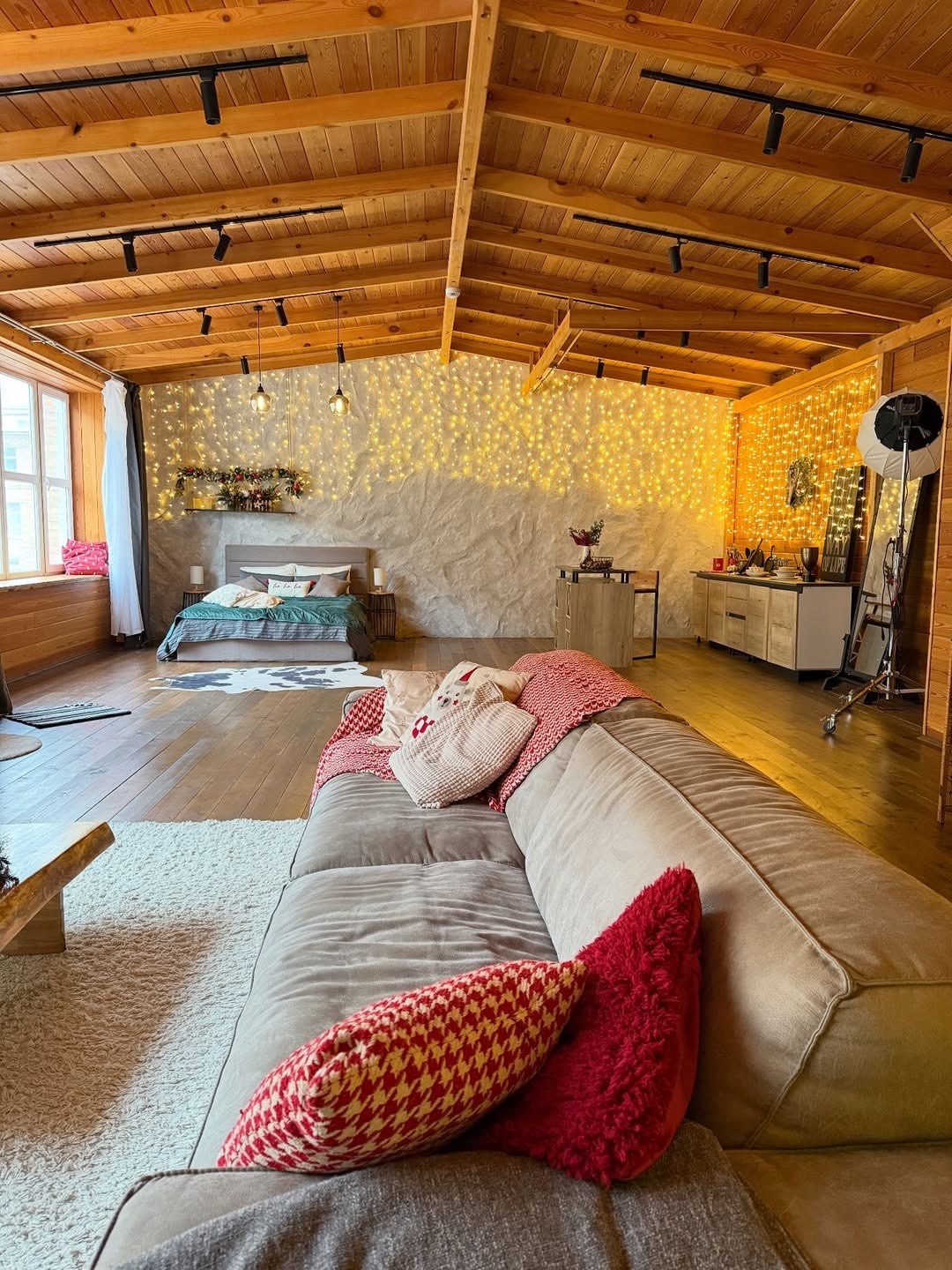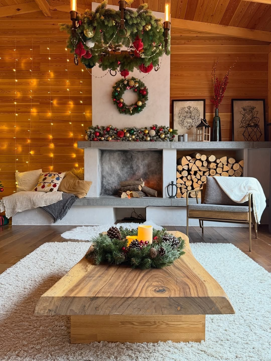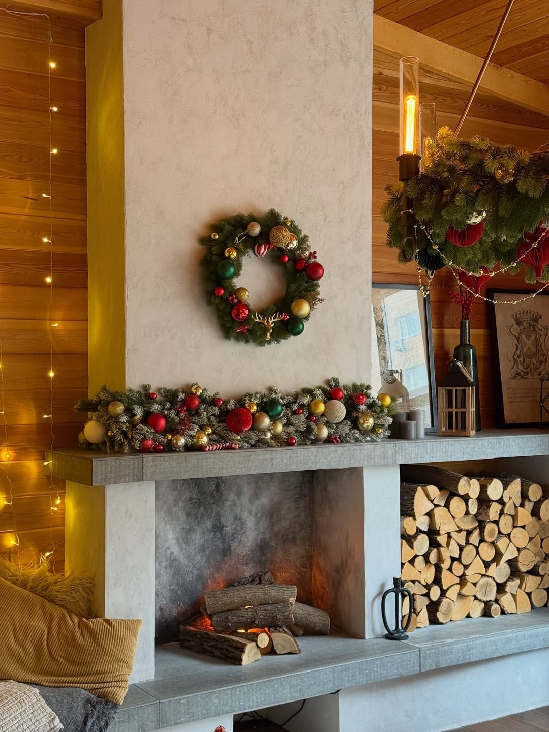 Интерьерная локация в стиле альпийского шале с каминной зоной и большим диваном.