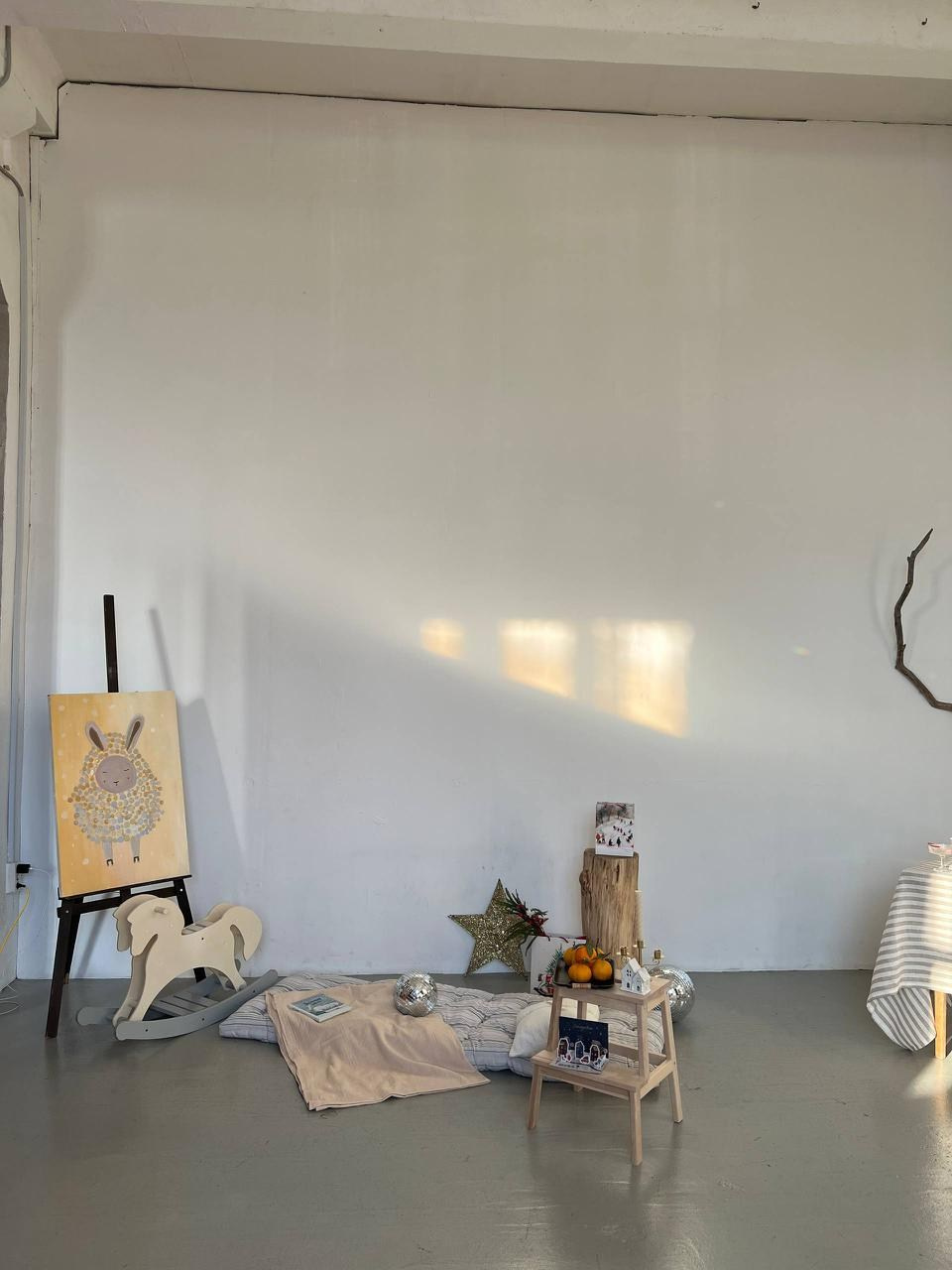 Зал 100 кв/м, высота потолков 4,5 метра, солнечный свет в студии от рассвета до заката. Имеется зона ресепшн, где есть место ожидания, примерочная и гримерное место. Локации меняются несколько раз в год, готовятся к праздникам и не только. Актуальный интерьер на нужную дату запрашивайте у администратора.